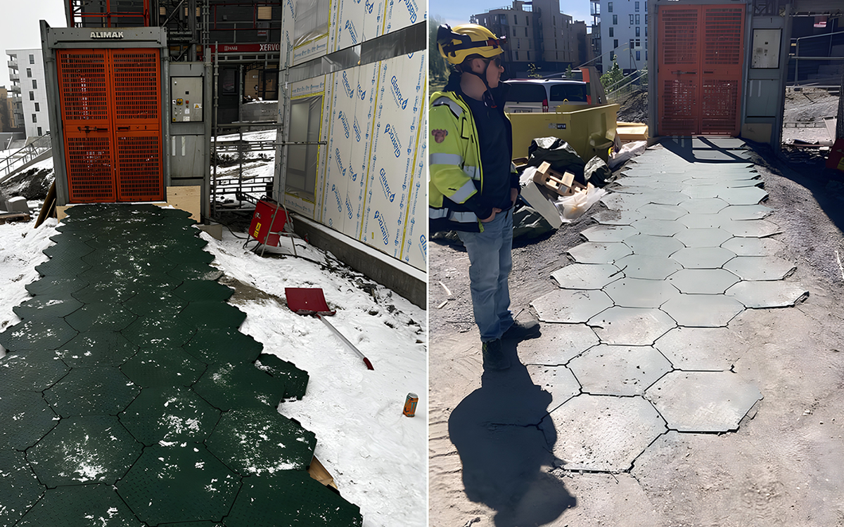 Today, temporary structures, such as plywood sheets combined with expanded metal, are used to create walkways, platforms, and surfaces in front of elevators, entrances, and on rooftops. While this has worked, it comes with several challenges: