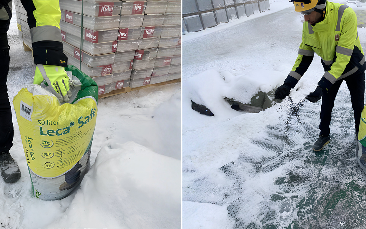 Several tests have been conducted with different anti-slip materials – sand, gravel, crushed stone, and salt. The material that showed the clearest effect was LECA pellets. They provide significantly better grip, are easy to handle, and perform optimally on the HSE Floor under challenging winter conditions.
